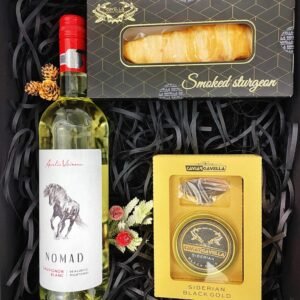 Un pachet cadou elegant ce contine o sticla de vin Sauvignon Blanc,si se potriveste perfect cu notele de fum din aroma fileului de sturion afumat.Toate produsele vin împachetate într-o cutie eleganta de cadou neagru mat.